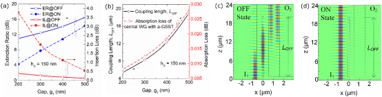 通过分析模式复用/开关内部结构及模式演变特性,该项工作引入Ge2Sb2Se4Te1相变材料作为开关节拍器,提出一种非易失性且具有超低损耗的模式复用/开关,实现零功耗开关状态保持。主要性能参数为:器件尺寸29.3 μm,在“OFF” 和 “ON”状态下,消光比分别达到18.98和22.18dB、插入损耗低至0.10和0.68dB,工作带宽覆盖S+L+C波段。该项工作为实现低功耗和smart-MDM光网络提供可行性方案。