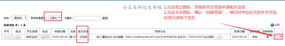 导师登录“研究生教育管理系统/学位论文/导师/学位论文管理/论文答辩信息管理”对员工答辩申请进行审核,点击页面右侧笔记图标查看研究生答辩申请相关内容,审核确认后,点击页面右侧书本图标确认“同意答辩”,填写导师对论文的学术评语,并点击“签名”图标在线完成电子签名。