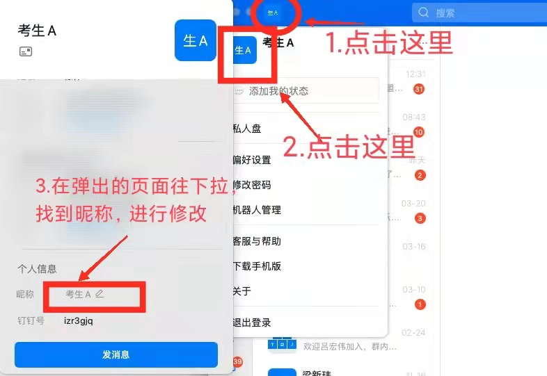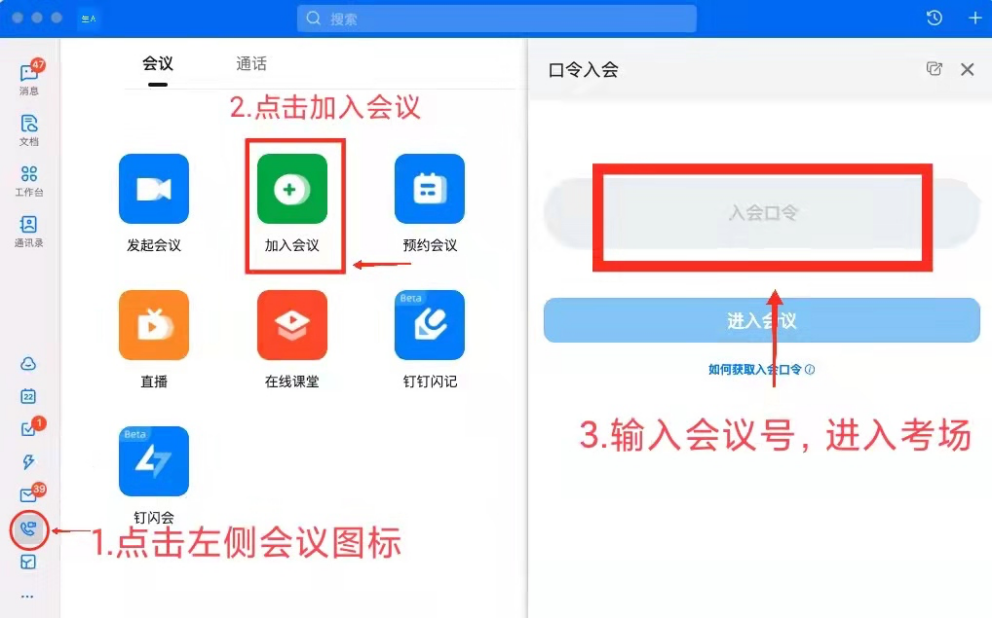 腾讯会议PC端 腾讯会议APP 备用平台:打开 钉钉会议 软件/APP,先修改昵称为“考生姓名A/B”,再点击左侧工具栏上的“会议”图标,在右侧输入会议口令,即可加入会议。钉钉考场将有2个会议号,一个是等候室,一个是正式考场,考生先进入等候室进行身份校验,校验通过后进入正式考场。