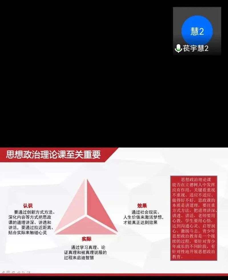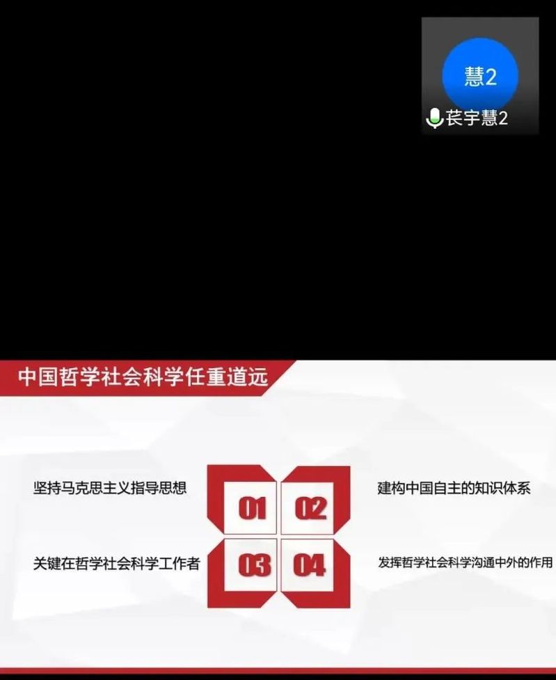 本次授课主题为“学习习近平总书记在中国人民大学考察时的重要讲话精神”。青年兴则国家兴,青年强则国家强。课程中,苌老师通过讲解五四运动引出本次授课的主题,并从“建设中国特色、世界一流大学”“思想政治理论课至关重要”“中国哲学社会科学任重而道远”“启示:当代青年当如何?”四部分进行讲授。苌老师全面讲述了中国人民大学的性质、历史、地位、使命,指出从中国人民大学可看出中国特色社会主义大学的初心和使命。苌老师表示中国哲学社会科学的发展应当坚持马克思主义指导思想,建构中国自主的知识体系,发挥哲学社会科学沟通中外的作用,关键在于哲学社会科学工作者。