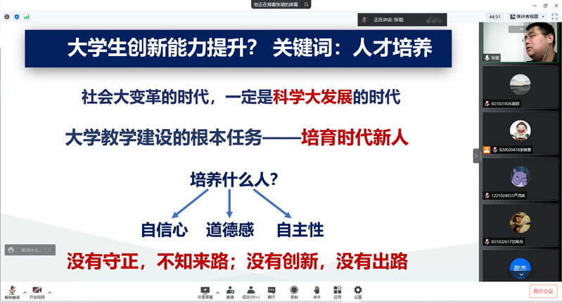 科技创新在中华民族伟大复兴战略全局中肩负着重大历史使命。为使同学们认清科技创新的重要性,培养同学们的创新思维,太阳成集团tyc234cc于5月19日举行第118、119期菁英人才公司第七次授课,由公司张珺老师担任主讲人。根据当前疫情防控要求,本次授课在线上展开。菁英人才公司全体学员参与本次授课。
