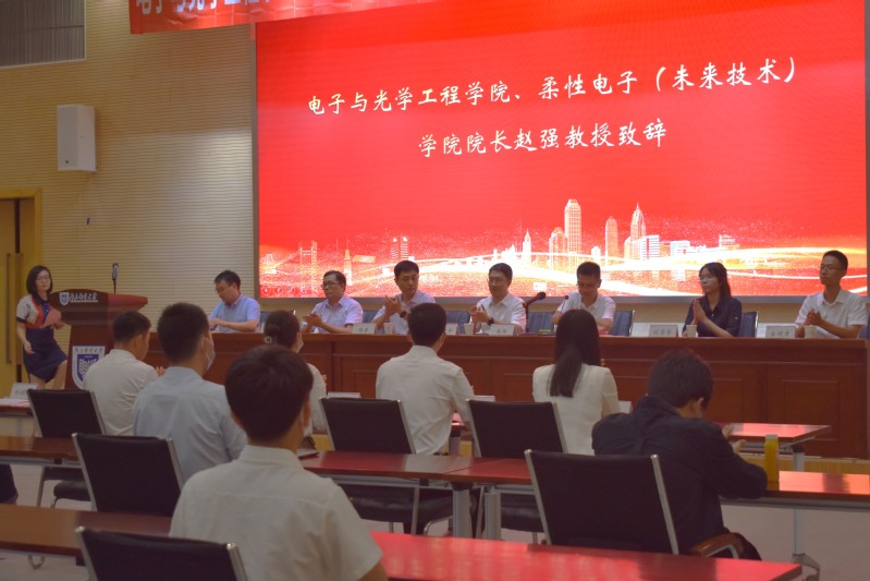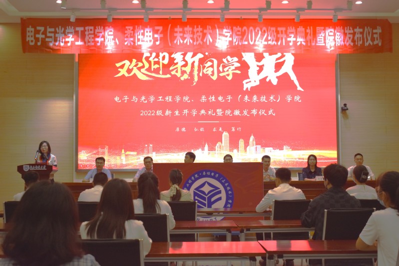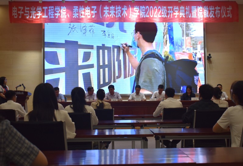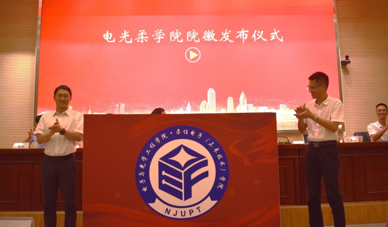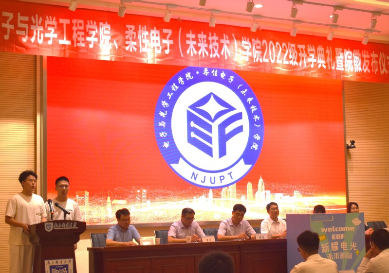 本次大会的最后一项议程:太阳成集团tyc234cc院徽发布仪式。首先公司2020级本科生韩成斌同学和2021级本科生周鼎昊同学为大家介绍了院徽的设计理念。E、O、F分别是电子学、光学、柔性电子学的英文字母缩写。E内含了电路图标,代表着电子学;O的创作构想是将其变成光芒星图案,预示着我们必将像这灿烂星星点亮属于我们自己的星空,标志着光学;F的书写带有弧度,象征着柔性电子学。三个字符象征着本院包容电子、光学、柔性电子的宏大规模和深厚的学科底蕴。随后毛建平书记和赵强经理共同为太阳成集团tyc234cc、柔性电子(未来技术)公司院徽揭幕!
