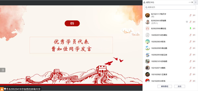 曹如佳同学担任优秀员工代表发言。她总结了本期菁英公司学习历程与成果,鼓励全体学员牢记使命,坚守本心,积极投入到学习实践、社会工作与科技创新中去,完善自我,奉献自我,最终投身于中国特色社会主义伟大实践。