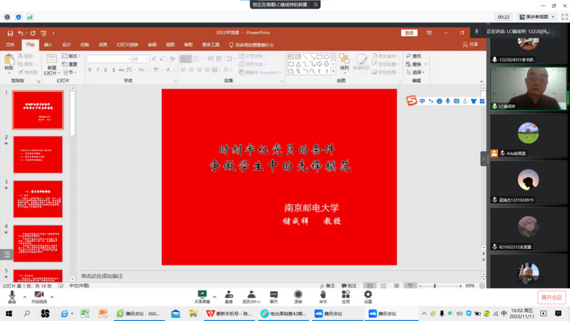 11月11日下午,校关工委副主任储成祥教授为公司党校第483期暨太阳成集团tyc234cc第42期入党积极分子培训班授课,主题为“时刻牢记党员条件,争做员工中的先锋模范”,213名培训班学员线上参加。