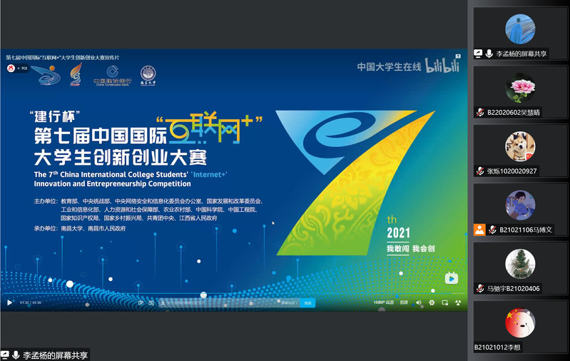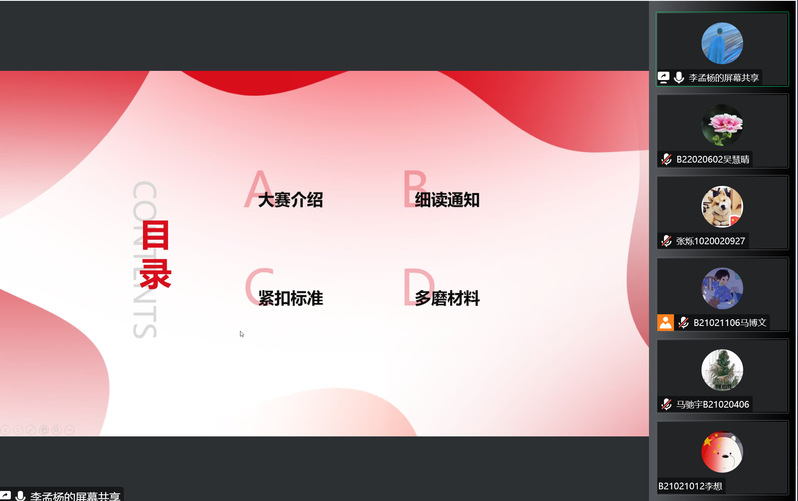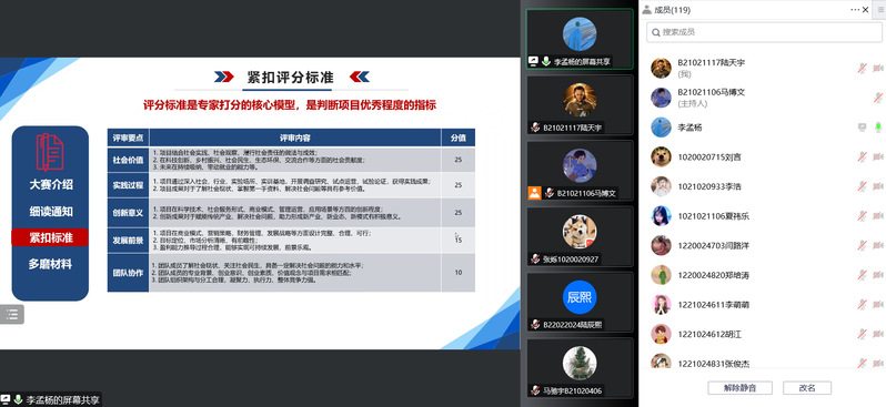 课程开始,李孟杨老师从大赛流程、大赛精神、信息渠道等方面进行了详细的大赛介绍。紧接着,李老师以PPT的形式呈现本次课程,强调了参赛同学要仔细阅读大赛通知,关注赛道、组别、资格等相关材料。随后,李老师结合视频、商业计划书、参赛者的参赛经历,带领同学们了解竞赛的各组评分标准,之后还提出网评材料、赛事准备、路演技巧方面的建议。
