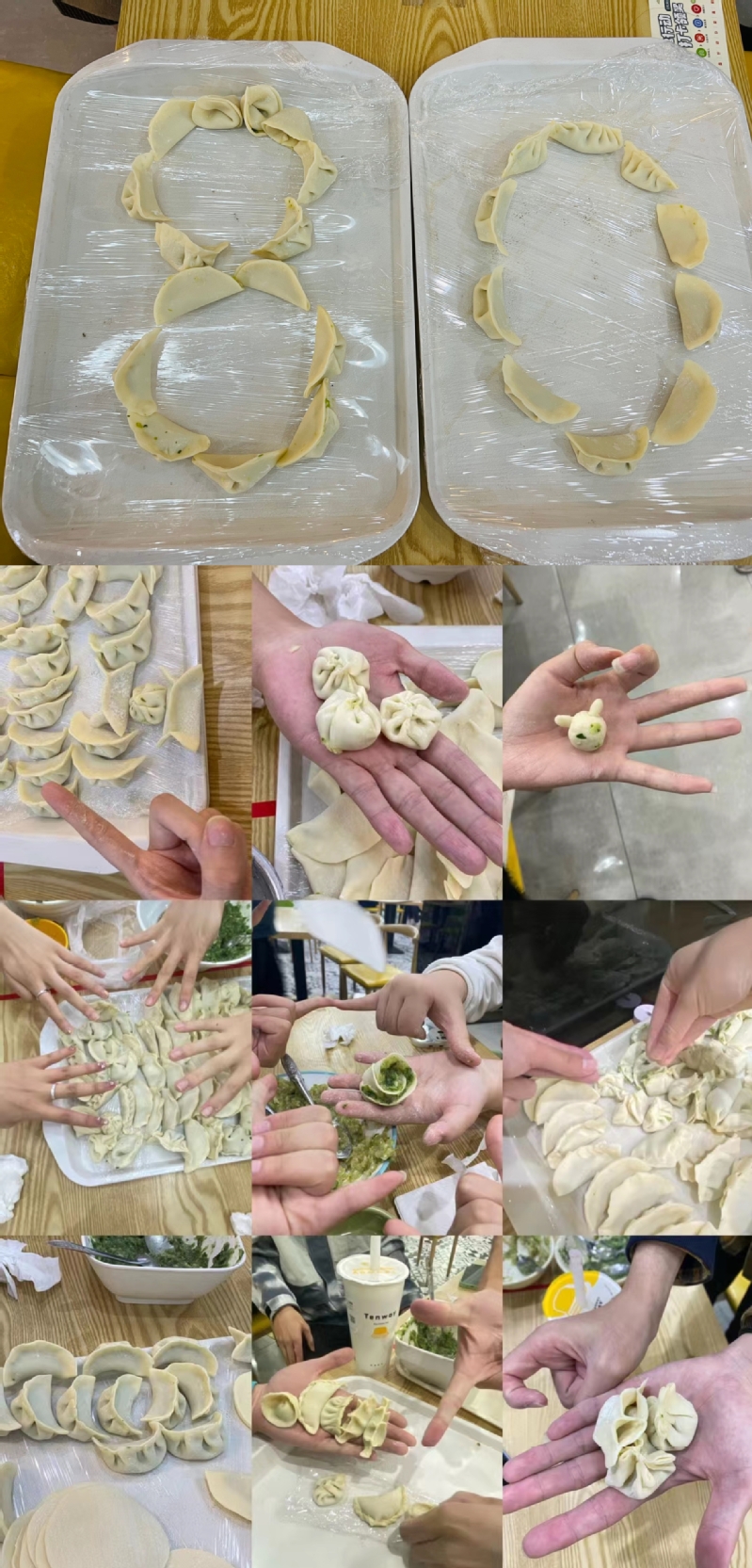 “包饺子,忆温馨;送祝福,齐欢庆”。老师们率先来到活动场地,各自展示包饺子的技艺。进可在台上循循善诱,退可于案前巧手裹月,真可谓“素衣台案前,巧手赛天工”。晚上五点整,同学们纷纷循香而至,受到了在场老师们火热氛围的鼓动,个个跃跃欲试,迫不及待地想要大展“手饺”。随着主持人的一声令下,同学们包饺子比拼活动拉开了帷幕。本次比拼共有三轮游戏环节——“第一个饺子”、“饺子争夺战”与“创意面点”。雪花纷飞舞,皎月平空现,不一会就有队伍完成了比赛,于是乎,各组便自发地开始了饺子花式摆拍大比拼,引得欢声不绝,笑逐颜开。