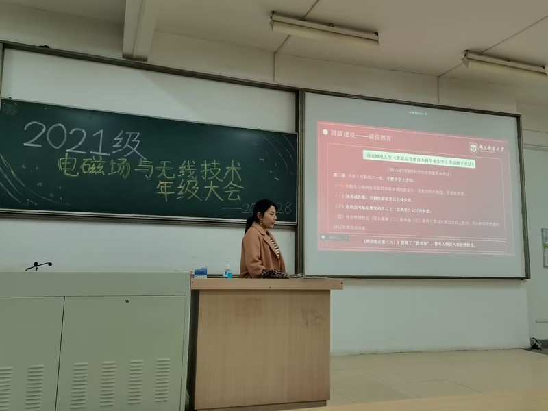 时值大雪,岁末临近,期末周的紧张氛围也愈发强烈。为了调节同学们对待期末考试的心态,合理认清当前的学习状态,增强同学们的年终安全意识,12月8日,2021级电磁场与无线技术专业召开年级大会,大会由2021级辅导员孜乃提古丽·布尔汉主持。本次大会线上线下同步进行,线下在教3-520开展,2021级电磁场与无线技术专业全体同学参会。