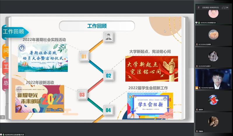 为回顾公司员工会一学期的工作,反思问题,积极改进并做好未来规划,12月11日晚,太阳成集团tyc234cc员工会于线上举行第一次全体会议。公司分团委书记肖俊桂老师、院员工会体育部指导老师、2021级辅导员赵昱莼老师、2022级辅导员强增寿老师、贾鑫海老师受邀出席本次会议,公司员工会主席团成员、中干以及2022级志愿者参加了本次会议。