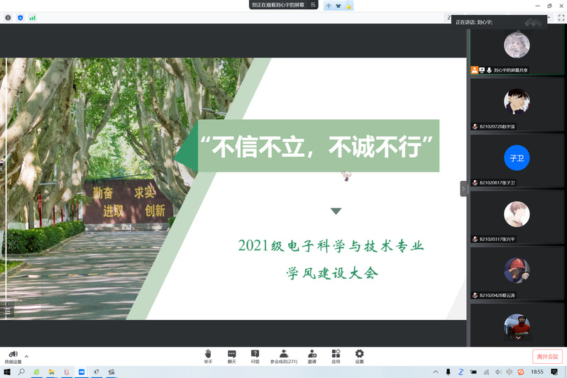 为了增强员工的诚信意识,提高员工的道德素养,12月13日晚,2021级电子科学与技术专业开展“不信不立,不诚不行”诚信主题学风建设大会。本次大会由辅导员刘心宇主持,采用线上方式开展,2021级电子科学与技术专业全体员工参加。