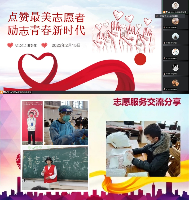 B210212班团支部主题团日活动采用线上线下相结合形式开展。线下实践中,同学们在家乡积极参加社会志愿服务,深入基层、深入社区,从小事做起,从身边做起;线上会议中,雷蕾、曾涛和涂闽三位同学分享了自己的志愿服务经历和心得,并呼吁当代老员工都应该积极践行志愿服务精神,营造“人人爱志愿、人人做志愿”的生动局面,为新时代国家发展做出贡献。