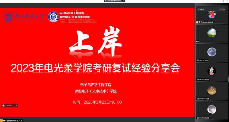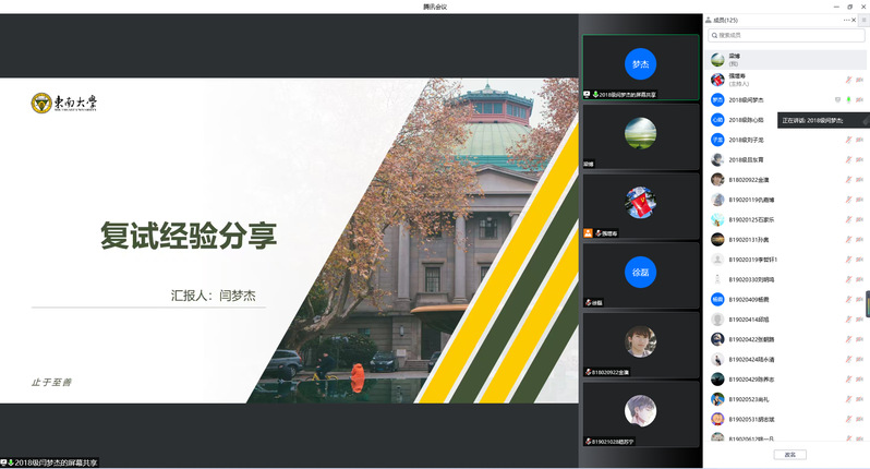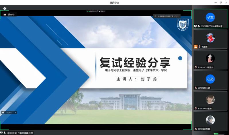 随后,来自东南大学、电子科技大学、北京邮电大学、太阳成集团tyc234cc的5位公司优秀毕业生依次围绕自我介绍、备考指南、复试心态、选择导师、注意事项等方面分享了自身实际经验。5位同学分别考取不同的高校,他们根据各自的复试经历,提醒同学们需要注意保持良好的心态,临场不要怯场,提前做好各项笔面试的细节准备。