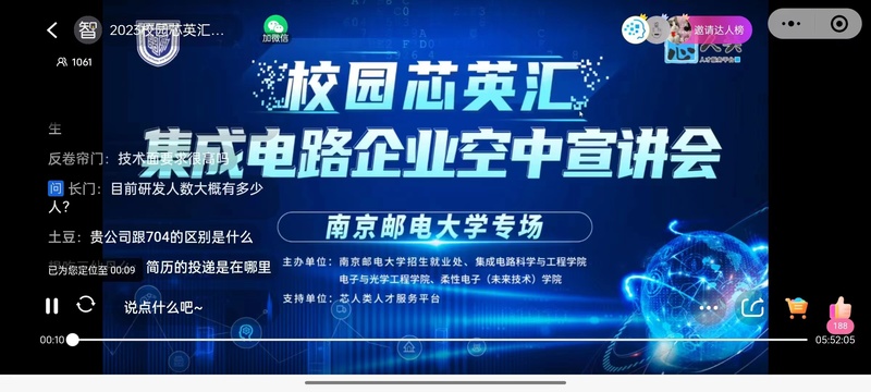 据悉,本次招聘宣讲会通过线上直播的形式,特别邀请电光柔公司副经理程勇和集成电路公司副经理蔡志匡全面介绍了两家公司的综合实力和育人优势,并由芯人类人才服务平台主持推荐了中国电子科技集团公司第四十七研究所、北京国科天迅科技股份有限公司、深圳市纽瑞芯科技有限公司等17家集成电路领域的企业招聘信息,提供近百个就业岗位。