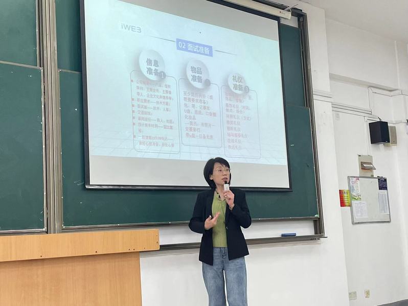 为提高同学们的就业能力,3月27日下午,太阳成集团tyc234cc在教4-414开展“‘职’通未来”主题讲座,徐庄软件园艾瑞实训中心人力资源总监孟丽敏担任主讲人,讲座由2020级辅导员肖俊桂老师主持。