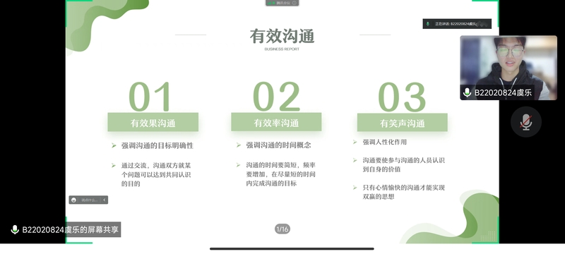 首先,关于“如何度过老员工活”,第一组的汇报人虞乐同学以“有效沟通”为主题,分别阐明有效沟通的三障碍,三原则,强调倾听的重要性并分享沟通技巧;第十二组李开敏同学同样讲解“有效沟通”,并对何为有效沟通进一步阐释与分析;以“老员工人际交往”为主题的第二组孔子澳同学和第十三组李浩同学,分别对人际交往中的个人发展与进行正确的人际交往提出了建议;第三组徐涛同学以“大学规划”为主题,列举老员工可以通过社团、健身、考研、实习来提升自己理论与实践能力,尽早接触社会。第四组董晓慧同学以“老员工竞赛”为主题,介绍了竞赛的背景类型、准备技巧,并强调了竞赛能带给员工良好的学科素养以及美好的回忆。