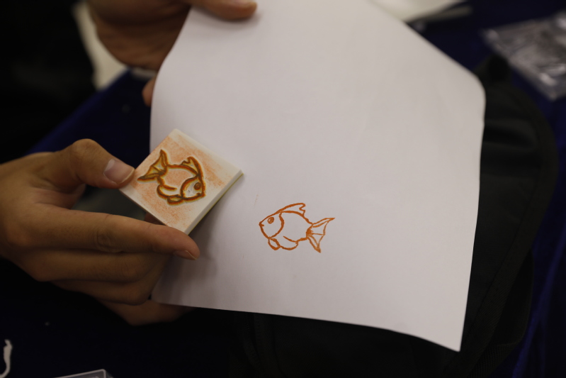 一个橡皮章的完成,贵在创想和现实联结的一刻。在雕刻的过程中,时间仿佛停止,同学们能完全沉浸其中,收获内心的平静和美好,深入感受文化与艺术碰撞,充分体会历史与现实贯通。刻章过程中,更有工作人员对有问题的同学提供帮助,并拍摄记录了刻章过程中的美好一刻。最后,同学们陆续完成了自己的刻章作品:图案雕工精湛,线条流畅,刻画生动细腻,栩栩如生;文字提顿起伏,一波三折,意蕴深远十足,内涵丰富。