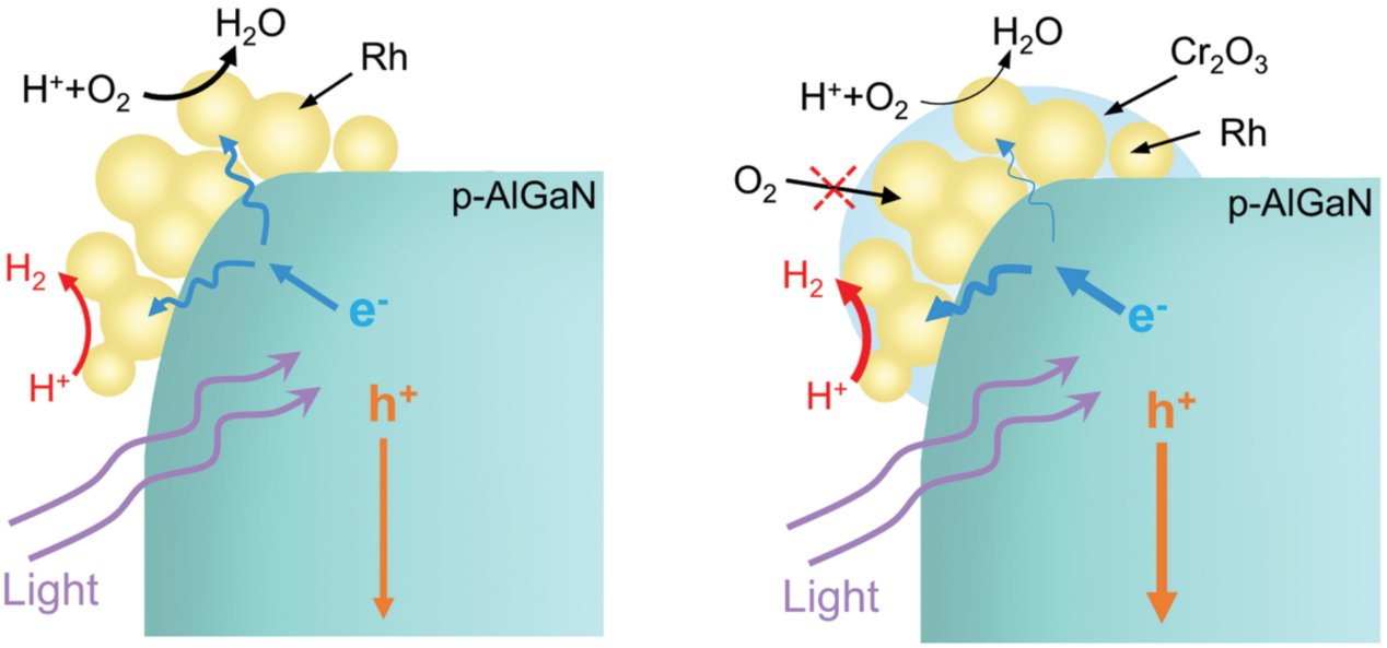 Rh/AlGaN和Rh-Cr2O3 /AlGaN纳米线表面载流子产生和迁移示意图