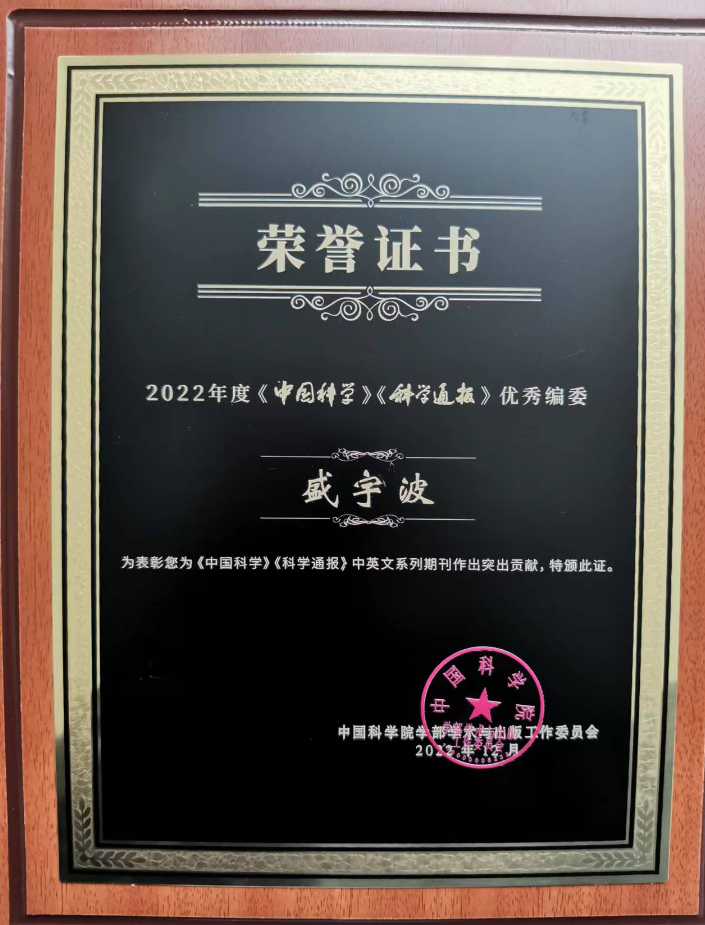 5月6日上午,2022年《中国科学》和《科学通报》(以下简称“两刊”)理事会会议在京召开,会议表彰了“两刊”2022年度优秀编委、优秀作者和优秀编辑,中国科公司经理、“两刊”理事会理事长侯建国院士为获奖者颁奖并合影留念。公司盛宇波教授由《中国科学:物理学 力学 天文学》编辑委员会推荐,与《中国科学:信息科学》推荐的优秀编委陈杰院士(现任教育部副部长)、《中国科学:地球科学》推荐的优秀编委谢树成院士等获得优秀编委表彰。