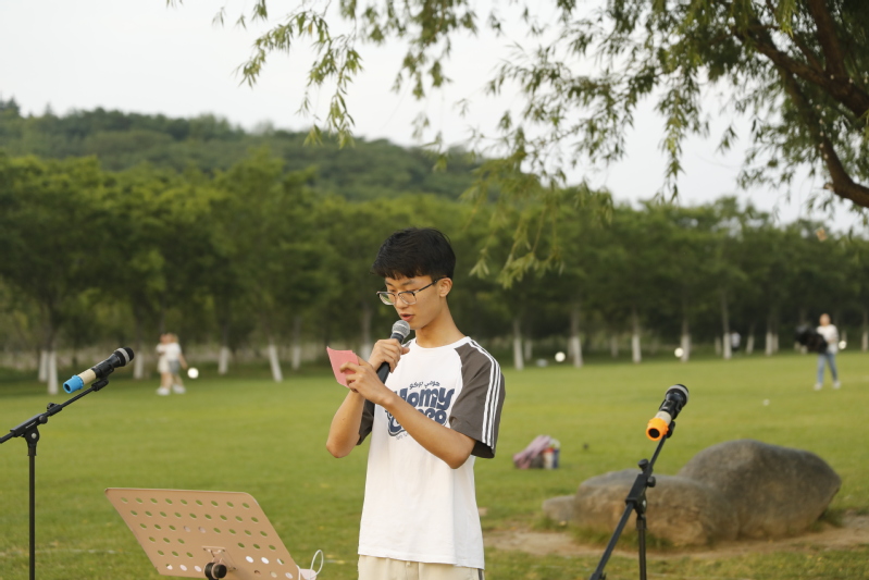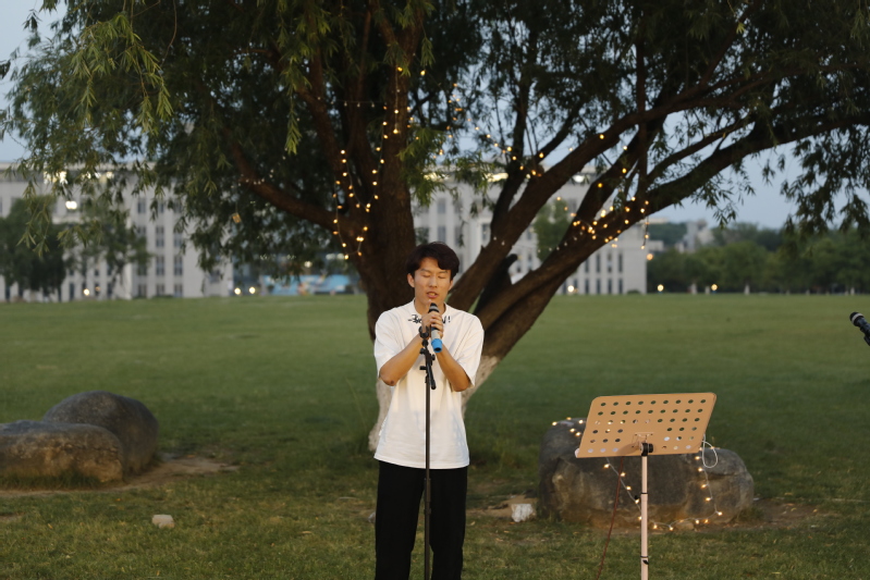 音乐总是有着震撼人心的力量,刚出场的两位同学用他们雄浑沉稳的男低音和慷慨激昂的男高音征服了全场听众,黄昏之下,他们听到了歌手对音乐的热爱、对生活的热忱,体会到了通过乐曲传达的情感共鸣。在乐声中,同学们席地而坐,兴致勃勃地言说乐律之道;有三两结伴,随口清唱;有傲然独立,朗声吟诵;有侧耳倾听,细嚼音籁;有闭目含笑,寻觅知音。气氛一路高升,居高不下。