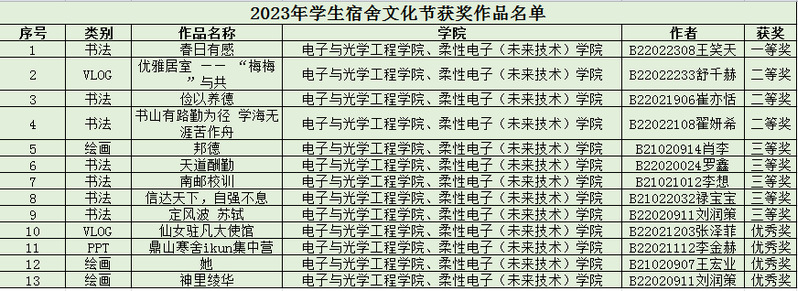 此次活动共有宿舍装扮展示、宿舍文化VLOG展示、软笔书法、绘画、公司宿舍文化特色活动五个展示项目,在辅导员老师的宣传和动员下,公司员工热情高涨、积极参与,共有65个参赛作品进入到公司评选环节。其中,软笔书法《春日有感》获得校级一等奖,软笔书法《俭以养德》等三项作品获得校级二等奖,绘画《邦德》等五个作品获得校级三等奖,另有四项作品获得校级优秀奖。