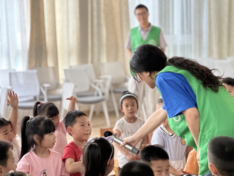 志愿者 “小白”老师通过动物的图片与声音来考验小朋友们对于动物的熟悉度,小朋友们积极踊跃地举手分享自己辨别出的动物。接下来白菜老师还对濒危动物与近危动物进行了讲解与科普,小朋友们认真听讲,表现真是太棒啦!