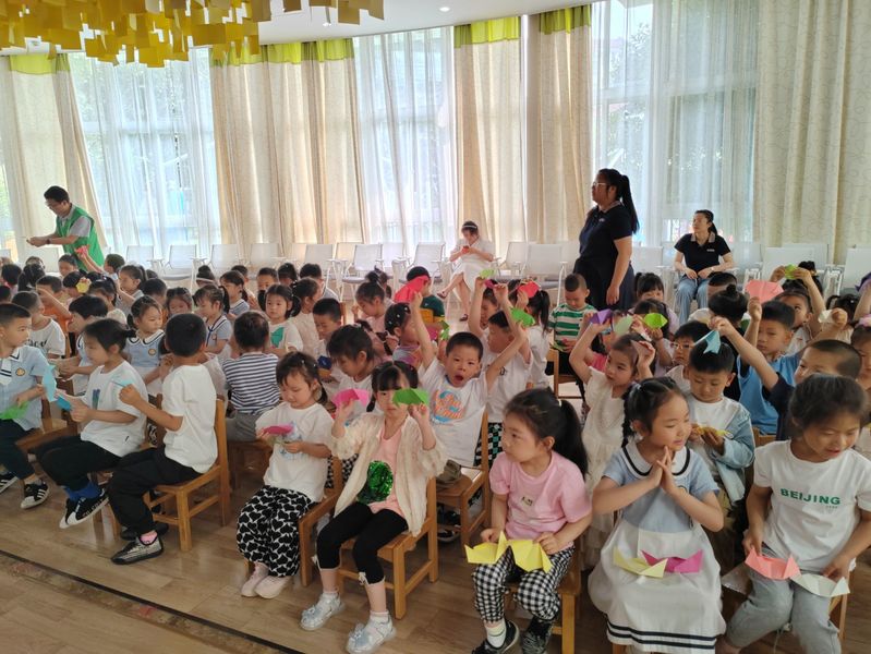 在课堂的最后,老师们带领小朋友们一起折纸。在志愿者哥哥姐姐的细心指导下,小朋友们手中彩纸一步一步变化成了五颜六色的小狗。小朋友们兴奋得将完成的折纸高高举过头顶,脸上都洋溢着开心的笑容,这便是对寓教于乐的最好诠释。