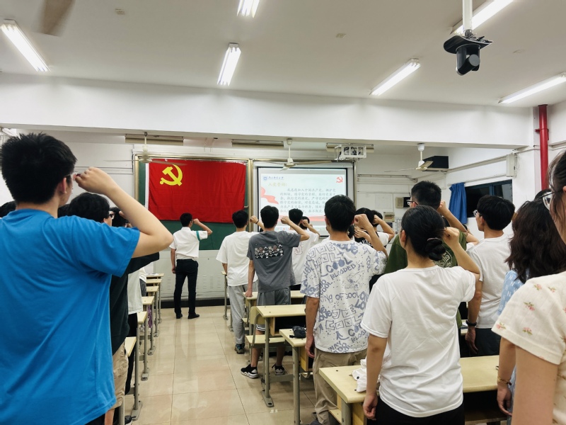 个人汇报结束后,入党介绍人依次介绍了发展对象的相关情况,对其能否入党表明自己的意见。江重九老师代表支部委员会向大会报告发展对象的审查情况,支部委员会通过广泛走访群众、召开座谈会以及函调证明等形式,经审查,陆乾霖等44名同志及直系亲属和主要社会关系拥护党的领导,遵守党纪国法,政历清白。与会党员充分讨论,并采取无记名投票方式依次进行表决,一致同意吸收陆乾霖等44位同志为中共预备党员。随后,在党支部书记刘振老师的领誓下,新发展的预备党员在党旗下庄严宣誓。