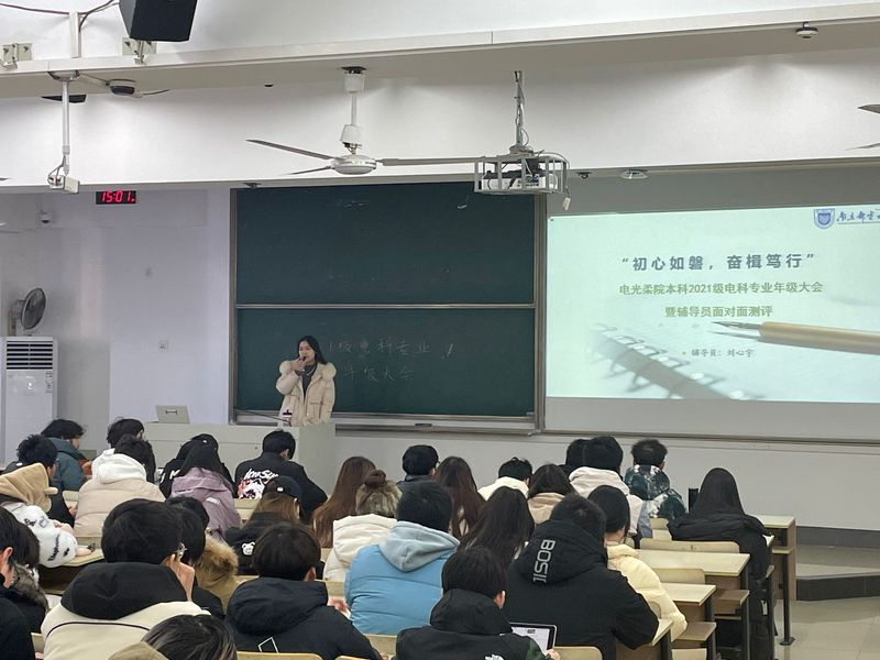 大雪压青松,青松挺且直;时光荏苒,砥砺前行,12月20日下午,电光柔院本科2021级电子科学与技术专业第一学期年级大会暨辅导员面对面测评在教2-309和教3-515顺利开展。大会主题为“初心如磐,奋楫笃行”,由辅导员刘心宇主持,2021级电子科学与技术专业全体同学参加。本次会议从多方面总结了这一学期各项工作与成果,也为同学们接下来的学习生活坚定了信念,指明了目标,激励同学们脚踏实地,勤奋笃学,不负韶华。