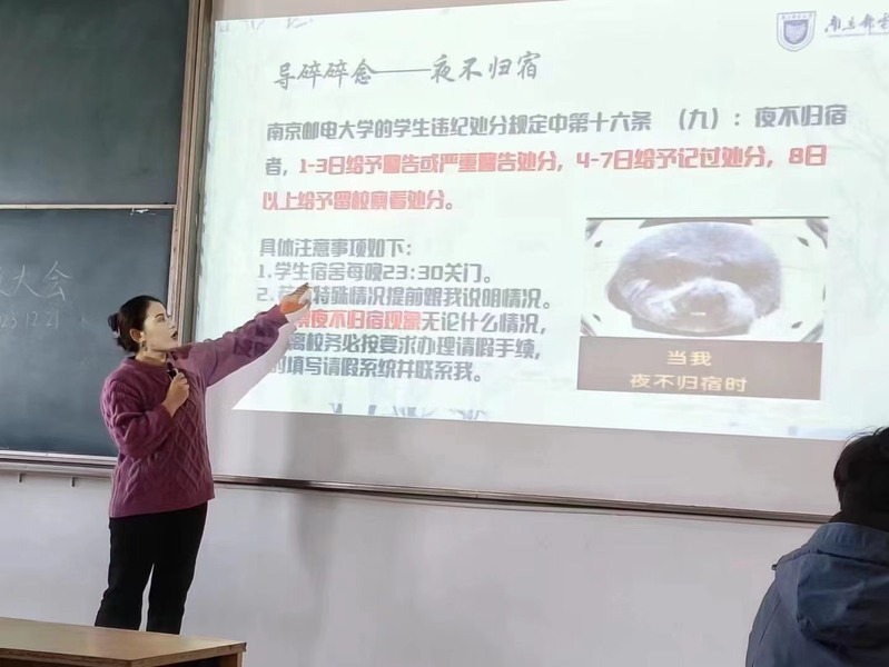 大会伊始,古丽老师在对于班级建设方面给同学们展示了2021级的学长、学姐们的评奖评优情况,同时向同学们细致地阐释了奖学金的评定细则并鼓励同学们用汗水与奋斗去获得属于自己的荣誉。随后,古丽老师向同学们展示了公司优秀学子们在支部建设方面所获得的表彰,鼓励同学们为自己团支部的建设贡献一份力量。古丽老师着重强调,临近学期末,希望同学们认真复习,诚信考试,并取得优异的成绩。最后,古丽老师对同学们的日常事务管理提出了要求,提醒谨防电信诈骗,规范请假销假流程,严禁夜不归宿现象,注意宿舍安全和卫生,并希望每一位电磁场学子辛勤忙碌的同时要注意身体,告诉大家要身怀家国情怀,爱国爱校,语言真挚而生动,体现了对同学们的深切关怀。