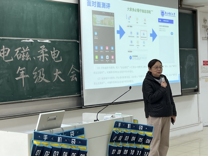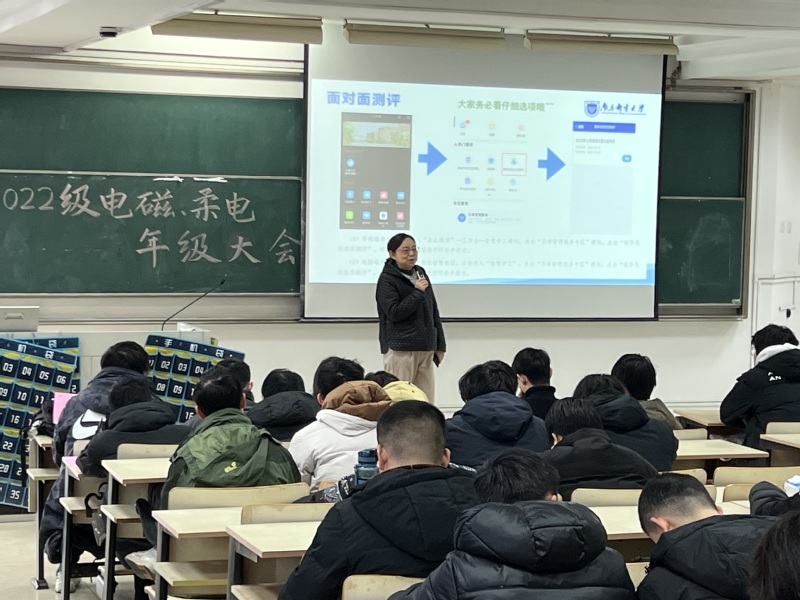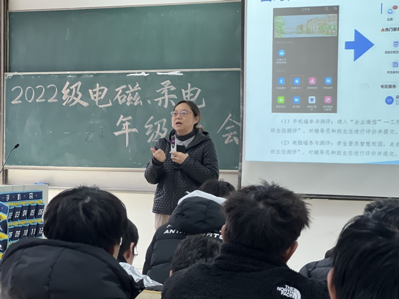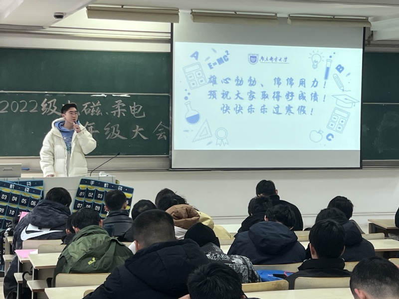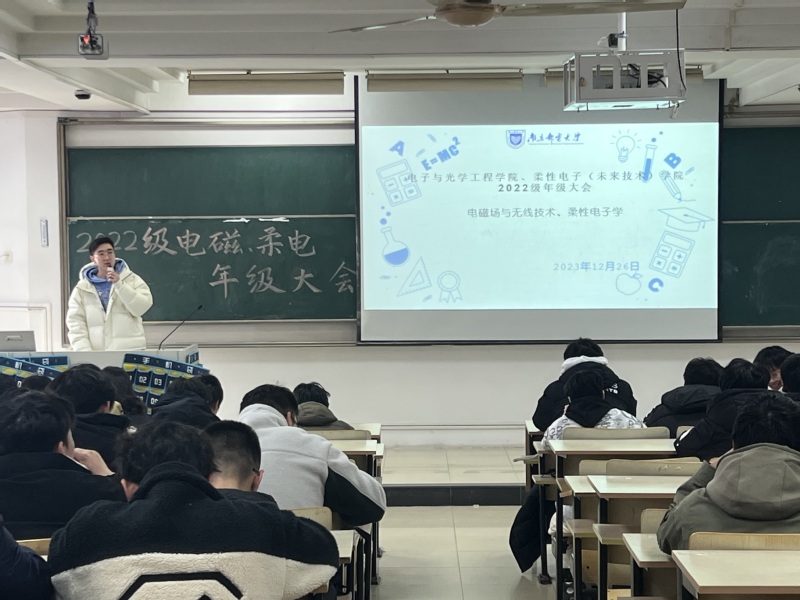 12月26日下午,2022级电磁场与无线技术专业、柔性电子学专业在教2-401教室举行“反复淬火,百炼成钢”主题年级大会,公司党委副书记、副经理徐磊老师出席本次大会,辅导员贾鑫海老师主持,全体同学参会。