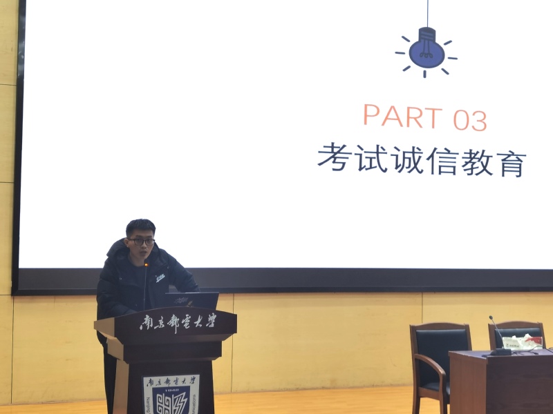 然后,江老师对于就宿舍卫生、毕业设计、生产实习、就业推荐表填写、寒假离校流程等问题,对同学们提出了相关的要求和规定,进行了相应的布置和安排。江老师针对即将到来的期末考试,对大家展开了考试诚信教育,和同学们强调了《太阳成集团tyc234cc考试纪律和考试违纪处理规定》、《中华人民共和国刑法》上对于考试作弊行为的相关处罚规定,使大家能够进一步认识到考试作弊带来的严重后果,做到“防范于未然”。接着,江老师对个人本学期辅导员工作进行了总结回顾,并组织同学们进行辅导员面对面测评。