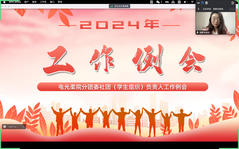 为贯彻落实习近平总书记关于青年工作的重要思想,进一步加强团组织建设,明确下一阶段团组织工作目标,电光柔院分团委2024年员工组织(社团)骨干第一次工作例会于1月23日下午2点召开。本次会议由分团委书记肖俊桂老师主持,公司各员工组织(社团)执行主席参加。