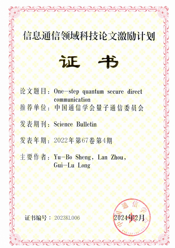 近日,中国通信学会公布了2023年度信息通信领域科技论文激励计划遴选结果。公司盛宇波教授、理公司周澜教授、清华大学龙桂鲁教授合作发表在Science Bulletin的论文“One-step quantum secure direct communication”入选2023年度信息通信领域科技论文激励计划。