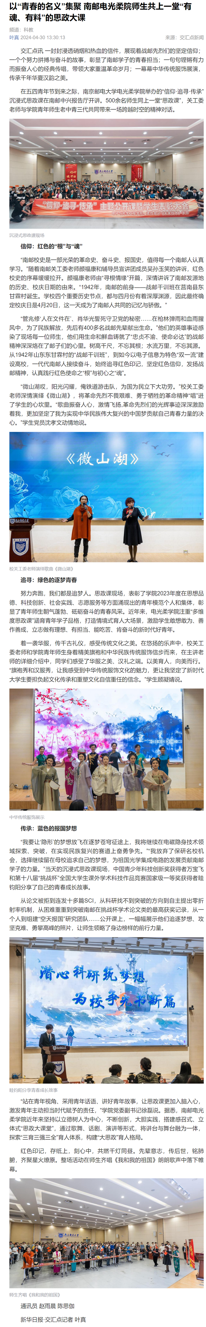 【新华日报客户端】以“青春的名义”集聚 南邮电光柔院师生共上一堂“有魂、有料”的思政大课