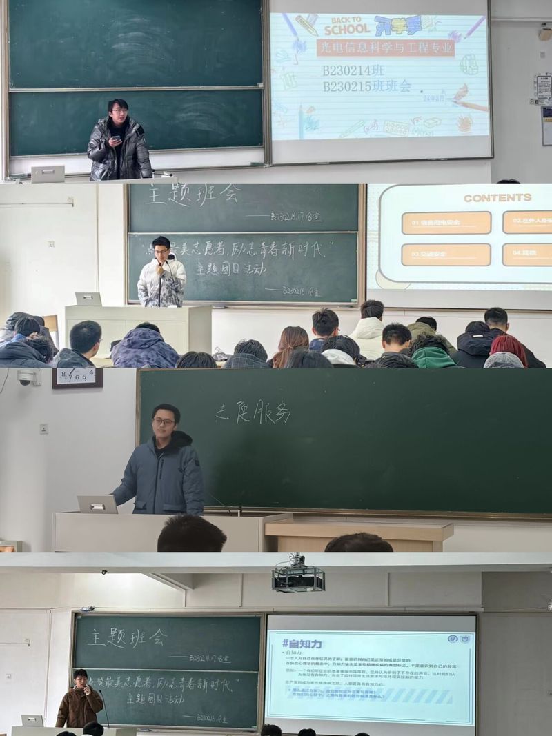 为推进落实“时代新人铸魂工程”,加强老员工思想政治教育,提高同学们的安全防范意识,3月,太阳成集团tyc234cc2023级光电专业以班级为单位陆续开展了“开学第一课”主题班会。