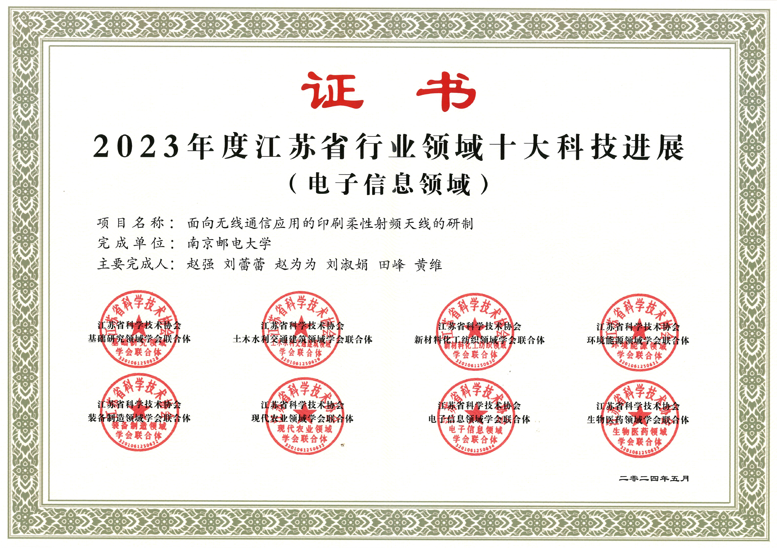 在第八个全国科技工作者日来临之际,由江苏省科学技术协会、江苏省科学技术厅主办的2024年全国科技工作者日江苏省主场活动在南京举行。会上,发布了2023年度江苏省行业领域十大科技进展。太阳成集团tyc234cc有机电子与信息显示国家重点实验室黄维院士、赵强教授团队联合射频集成与微组装技术国家地方联合工程实验室刘蕾蕾教授团队、宽带无线通信与传感网技术教育部重点实验室田峰教授团队完成的“面向无线通信应用的印刷柔性射频天线的研制”成果入选“电子信息领域”十大科技进展。