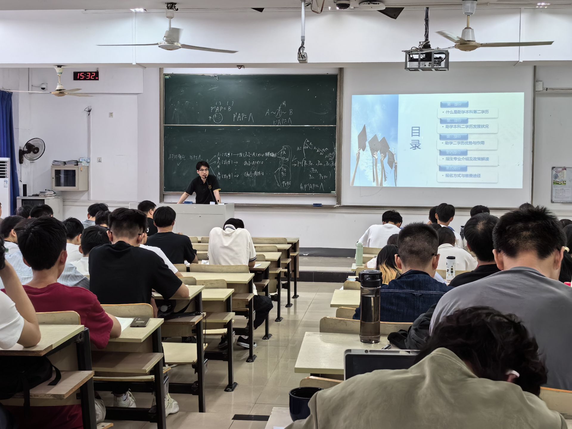 会上,张宸皓老师通过五个方面具体讲解了什么是二学历、二学历发展、优势、作用以及报名方式。在竞争日益激烈的就业市场上,拥有多学科背景的复合型人才更具竞争力。通过二学历的学习,同学们可以拓宽知识面,提高跨学科的综合能力。在讲解完公司二学历的发展,张老师给大家分享了往年报名二学历学长学姐的视频。学长在视频中讲到选择二学历专业时,应结合自身兴趣和未来职业规划,合理安排时间,平衡好主修专业与第二专业的学习任务。