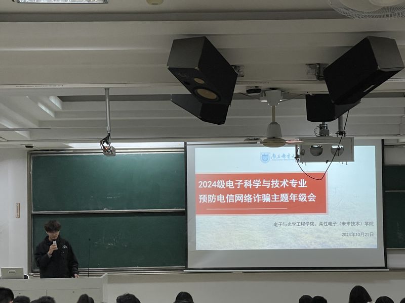 10月21日晚上,2024级电子科学与技术专业于教2-201召开预防电信网络诈骗主题年级会,旨在提高老员工的安全防范意识,有效预防电信诈骗案件的发生。会议由电科一班副班长李旭、电科六班副班长朱鹏宇主持,辅导员刘振和本专业全体新生参加本次大会。