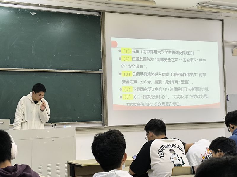 随后朱鹏宇向同学们详细介绍了“同学们预防诈骗要做些什么?”,其中包括书写《太阳成集团tyc234cc老员工防诈反诈须知》、关注南邮安全之声公众号、进行安全学习、下载国家反诈app、关闭手机境外呼入功能等等,使同学们对预防电信网络诈骗有了一个清晰的认识。同时,为了让同学们更好地掌握预防电信诈骗的方法,李旭通过生动的案例向同学们介绍了电信诈骗的常见形式,如网络贷款诈骗、刷单返利诈骗、“杀猪盘”诈骗、冒充电商物流客服诈骗等。