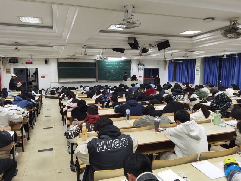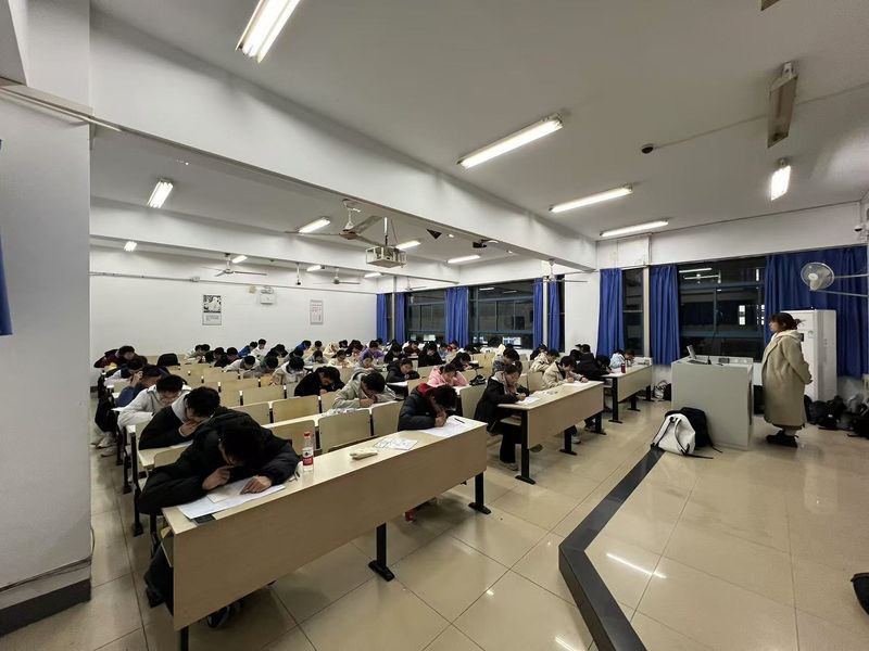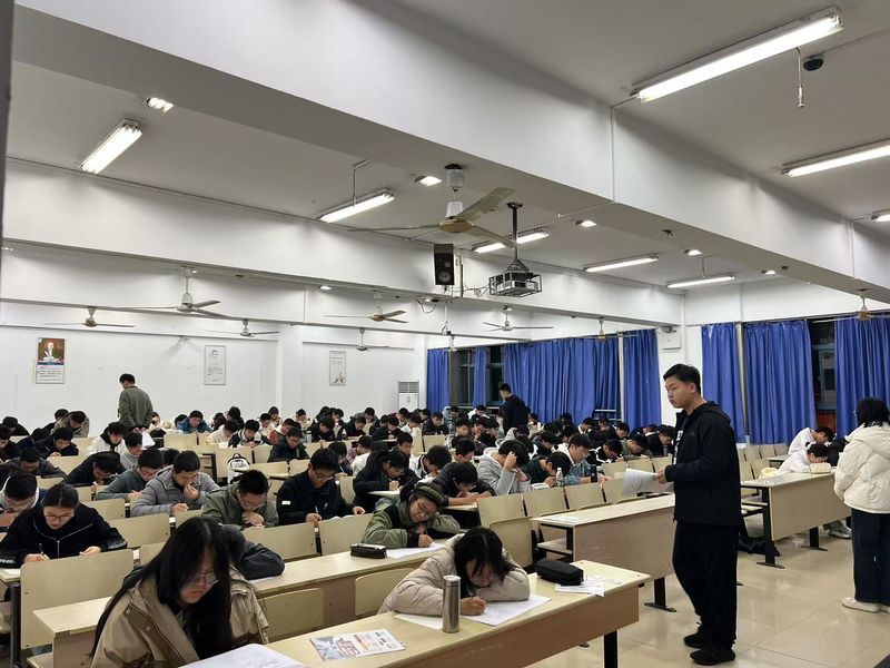 考试在大一晚自习教室进行,2024级新生辅导员及班主任助理到现场组织考试,负责考试的监考、巡查工作,确保考试顺利进行。