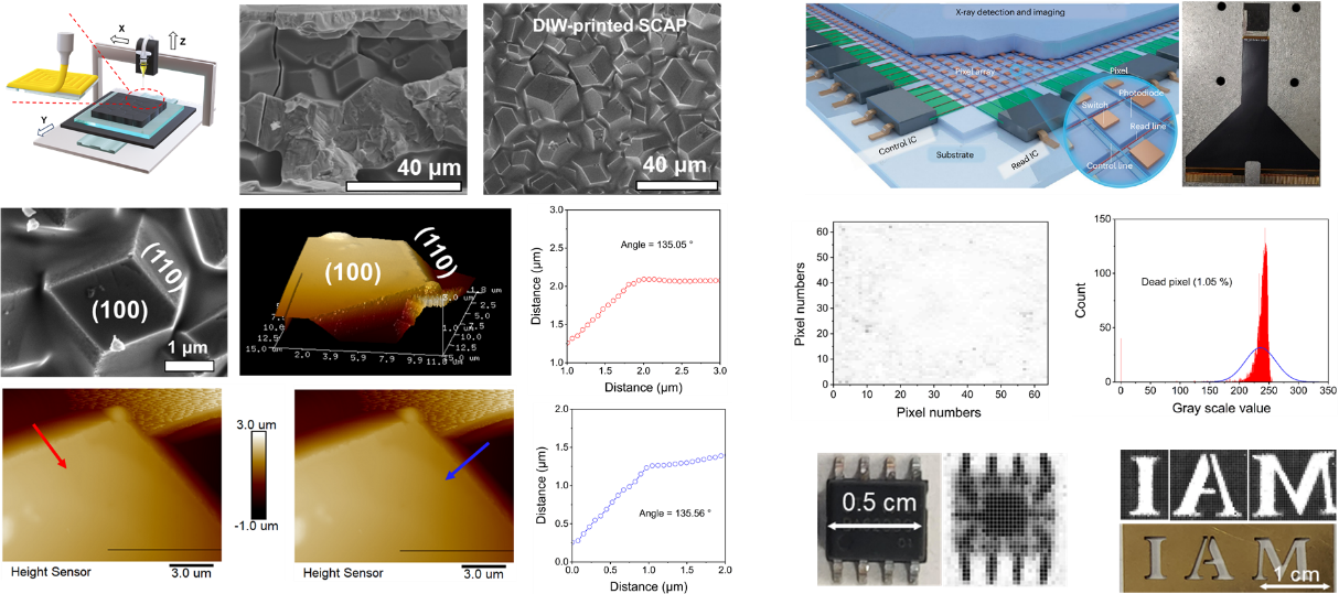 作为当前最受瞩目的X射线探测材料,钙钛矿及其X射线探测器的研发为我国突破X射线成像这一“卡脖子”技术带来了契机,然而,兼容TFT电子读出背板高质量钙钛矿厚膜的制备是当前限制钙钛矿X射线探测器发展的瓶颈难题。有鉴于此,公司赵强教授、徐修文教授团队自主发展了一种全新的直写印刷(Direct-ink-writing, DIW)单晶组装钙钛矿制备工艺,研制出TFT集成的X射线面阵探测器,实现了高分辨的X射线数字成像。相关成果以“Direct ink writing of single-crystal-assembled perovskite thick films for high-performance X-ray flat-panel detectors”为题发表于国际权威期刊Advanced Functional Materials。