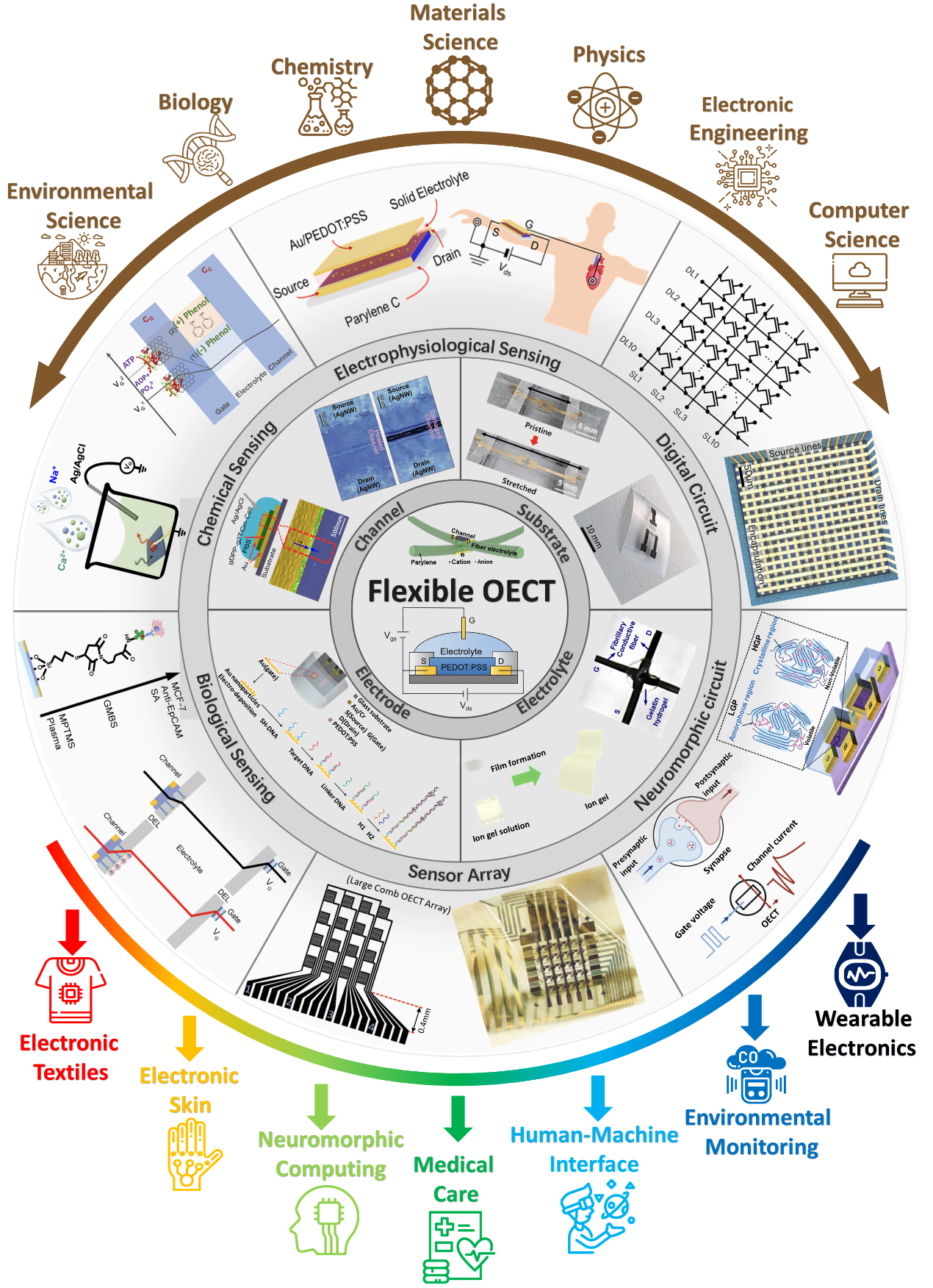 图1 柔性OECT的组成及其在电生理信号传感,化学传感,生物传感,传感器阵列,数字电路,神经形态电路领域的应用