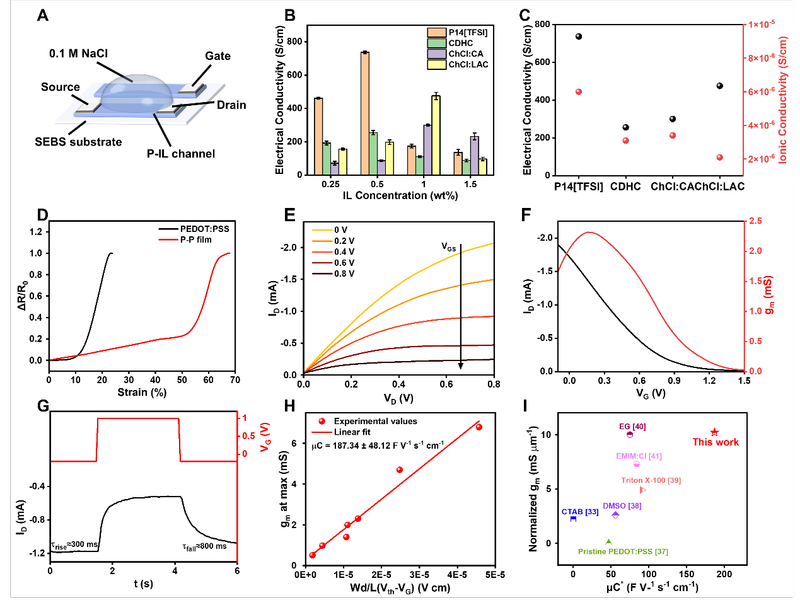 针对上述问题,公司赵强教授、李杨教授团队开发出一种高性能可拉伸OECT,并成功将其与深度学习算法集成,构建了一套用于OSA检测的高精度、无线化、智能化的电生理监测系统,为便携式电生理监测和智能睡眠评估开辟了新途径(图1)。在材料优化方面,研究团队首先筛选了一系列生物相容离子液体(ILs),并最终采用N-甲基,丁基吡咯烷双三氟甲磺酰亚胺盐(P14[TFSI])对PEDOT:PSS进行改性。该方法显著提高了PEDOT:PSS的电子电导率(~740 S cm-1)、离子电导率(6×10-6 S cm-1)和拉伸性(~60%),确保OECT能够在应变条件下精确捕捉电生理信号。相比传统添加剂,P14[TFSI]的引入有效提升了PEDOT:PSS的离子-电子传输效率,并增强了机械稳定性,使其更加适用于长期可穿戴生物电子设备(图2)。