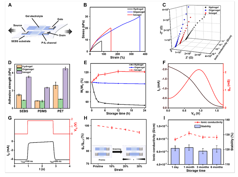 图 3. 基于凝胶电解质的高性能长期可穿戴OECT