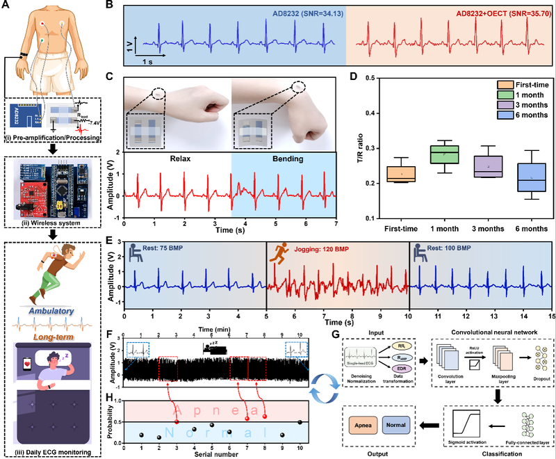在系统集成方面,研究团队充分利用OECT的局部放大特性,将其作为前置放大器,显著提升了信号质量,实现了高达35.7 dB的信噪比(图4)。这一性能优势使系统能够清晰捕捉微弱的生理信号变化,为高保真电生理监测提供了强有力的技术支撑。在此基础上,研究团队进一步集成了低功耗蓝牙模块和微控制器,实现无线数据传输,使系统能够在动态环境下进行实时监测。测试结果表明,即使在运动状态下,该系统仍能捕捉清晰心电(ECG)信号,为长期睡眠监测提供了可靠保障。为实现OSA的智能检测,研究团队创新性地将深度学习算法与OECT系统相结合。通过单导联ECG信号中的R波间隔(RRI)、R波幅值(RAMP)及ECG衍生呼吸信号(EDR)等关键特征,构建了基于卷积神经网络(CNN)的自动检测模型,为OSA的早期筛查提供了有效工具。
