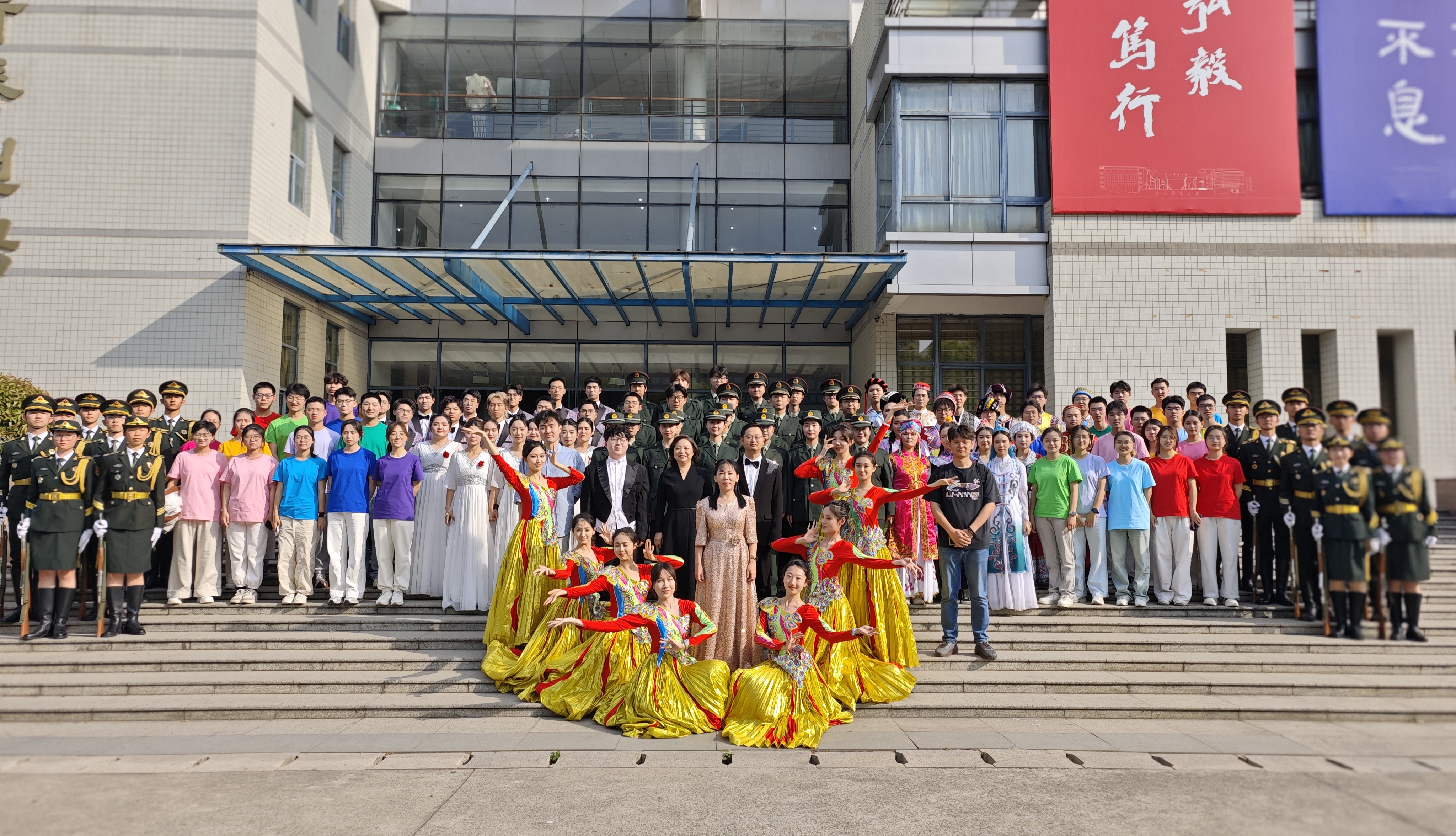 文化育人厚植家国情怀。当“走向复兴!走向复兴!走向复兴!创造辉煌!”的叠唱如浪潮般层层推高,穹顶灯光骤然倾泻而下。八名员工身着鎏金舞裙翩然登场,她们双臂舒展如展开的羽翼,旋转间,裙裾上暗藏的56颗水晶随灯光变幻,恰似星河落入人间;身着彩衣的青年学子手执鲜花,奔跑着向舞台中央汇聚,朝气蓬勃的面庞和绚烂怒放的鲜花相互辉映,青春之中国、盛世之中国在此刻具象化。