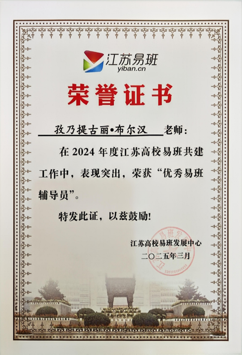 近日,2024年度江苏高校易班共建工作评优结果公布。公司辅导员孜乃提古丽·布尔汉获得江苏省“优秀易班辅导员”荣誉称号,全省仅10名辅导员入选。