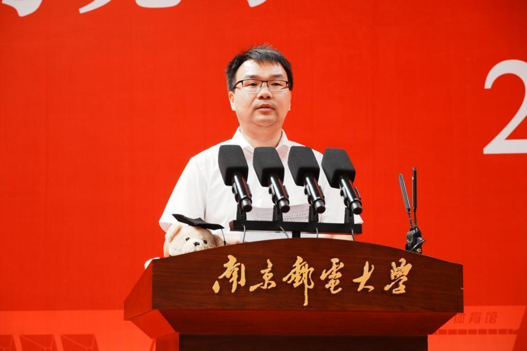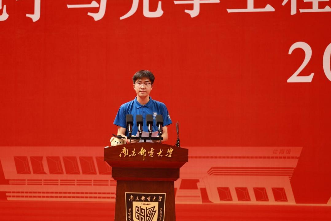 2025级研究生新生代表、校优秀本科毕业生——2020级光电信息科学与工程专业员工、江苏省优秀员工干部,全国第26届研究生支教团优秀支教教师贺哲发言,他分享了自己的青春成长历程,并号召同学们恪守学术规范、锤炼技术能力、勇担时代使命,怀抱梦想又脚踏实地,敢想敢为又善作善成,让青春在全面建设社会主义现代化国家的火热实践中绽放绚丽之花。