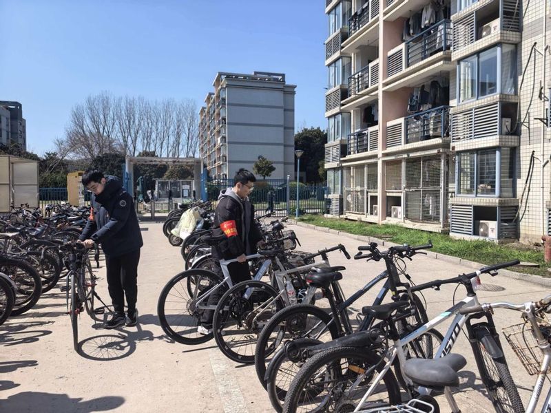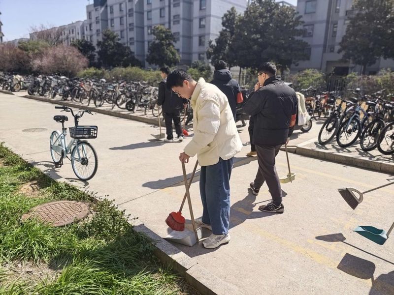 活动伊始,支部党员们准时集结、分工明确,带着扫帚、簸箕、垃圾袋、垃圾夹等工具前往青年教师公寓1期门口。大家迅速进入状态,以饱满热情投入环境整治,重点对公共区域地面清扫、自行车规范摆放、门口死角清洁等任务逐项落实。党员们不怕脏、不怕累,俯身捡拾纸屑杂物、细致清扫路面灰尘、耐心整理乱停车辆,将零散自行车逐一归位、排列整齐,既保障通行顺畅,也让公寓出入口面貌焕然一新。